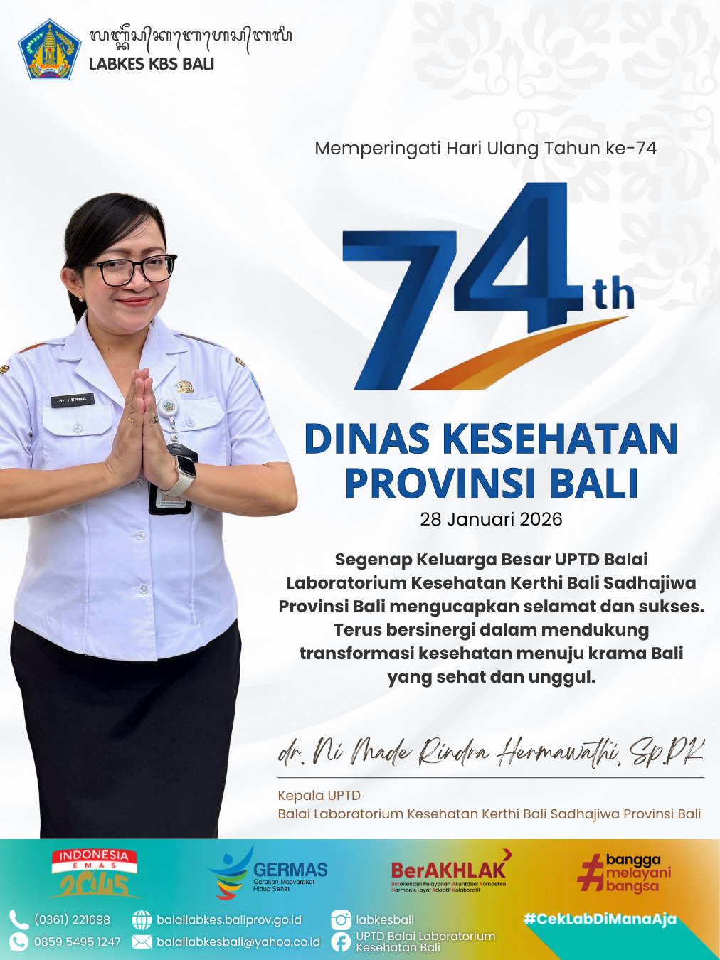 Segenap Keluarga Besar UPTD Balai Laboratorium Kesehatan Kerthi Bali Sadhajiwa Provinsi Bali mengucapkan selamat dan sukses atas bertambahnya usia pengabdian yang ke-74.