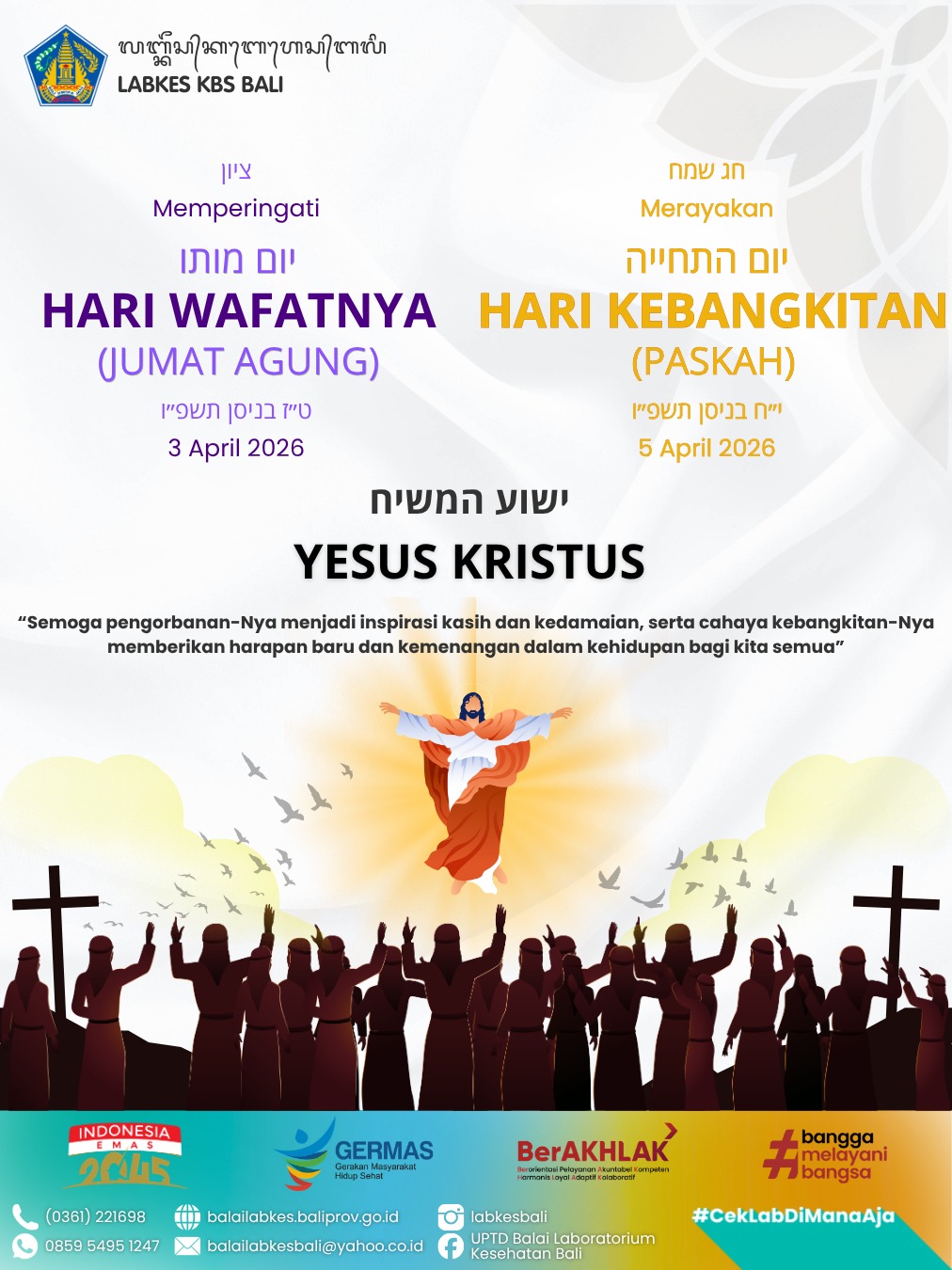 Segenap keluarga besar UPTD Balai Laboratorium Kesehatan Kerthi Bali Sadhajiwa Provinsi Bali mengucapkan selamat memperingati Jumat Agung dan menyambut Hari Raya Paskah 2026 🕊️✨